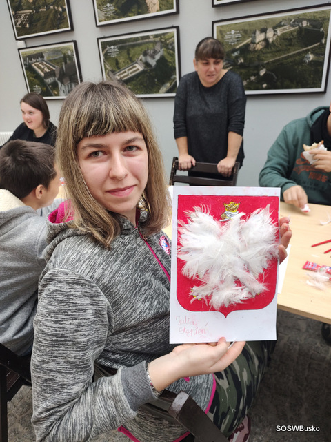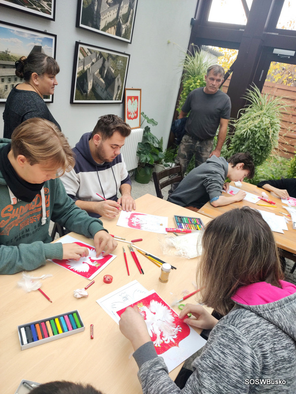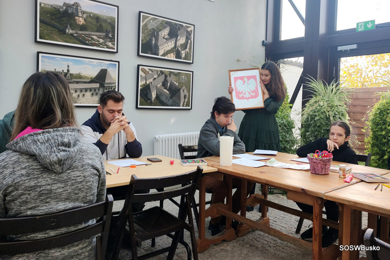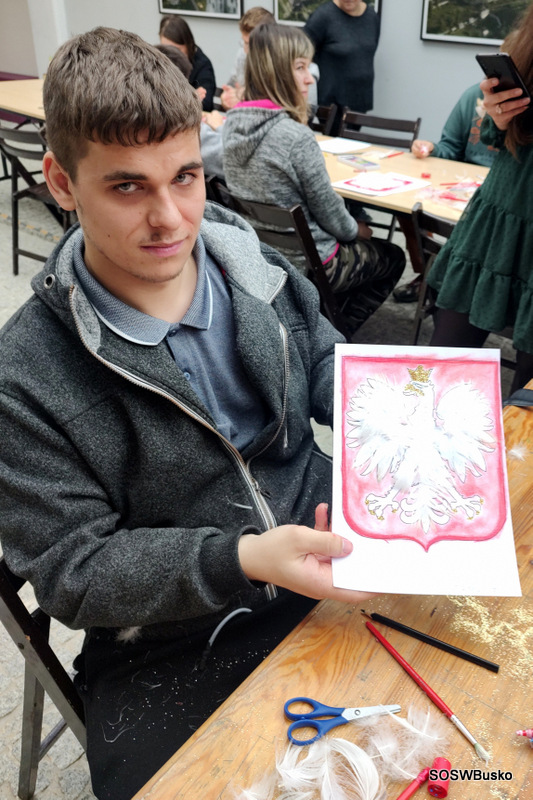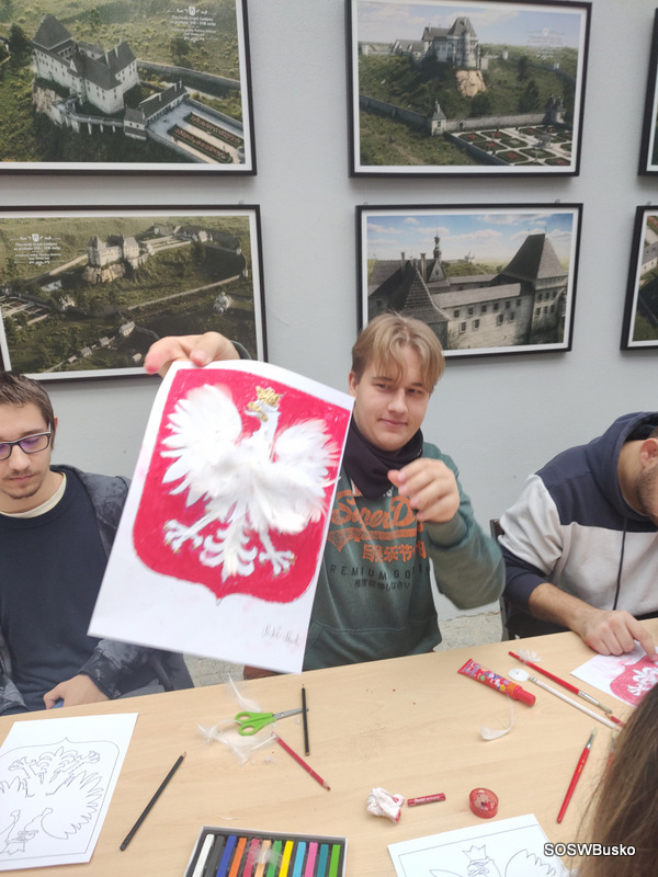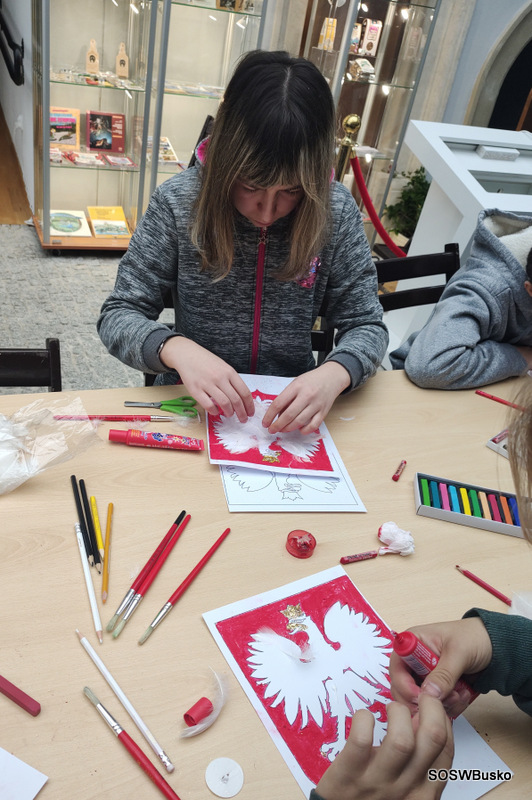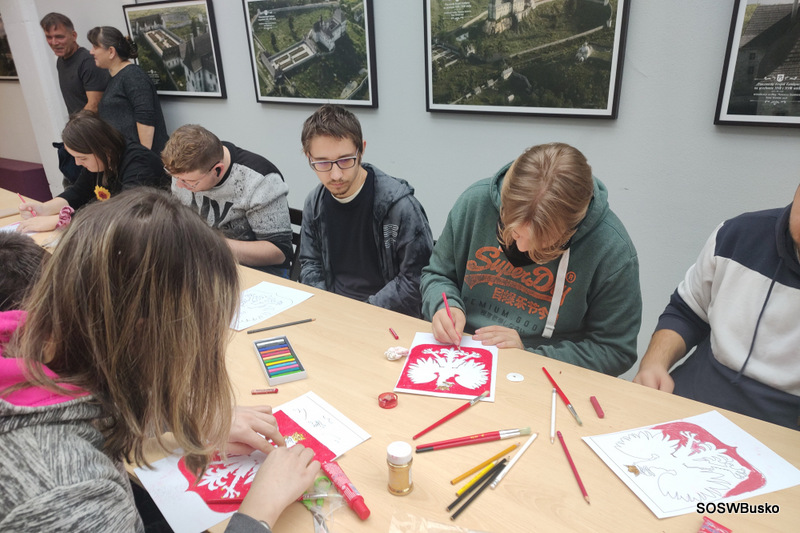 Po skończeniu zwiedzania uczestnicy wycieczki wzięli udział w warsztatach niepodległościowych, na których z bardzo dużym zaangażowaniem wykonywali godło Polski. Pod koniec zajęć dołączył do młodzieży starszy dokumentalista/ archeolog Pan mgr Dariusz Greń, który zaprosił ich do Ośrodka Edukacji Przyrodniczej w Umianowicach na lekcję muzealną w terenie. Z wielką pasją Pan Dariusz opowiedział o pracy archeologa. Pokrótce omówił epokę kamienia, brązu i żelaza. Podał ciekawe informacje na temat ludzi mieszkających w danej epoce oraz o ich codziennym życiu. Wspomniał również