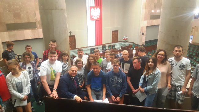 Dnia 5 czerwca 2018 roku przeżyliśmy niesamowitą przygodę. Mieliśmy okazję, pod opieką pani Agaty Wolskiej i pana Wojciecha Kuźmińskiego zwiedzić Sejm Rzeczypospolitej przy ulicy Wiejskiej w Warszawie. Wyjechaliśmy o czwartej rano, w związku z czym niektórzy z nas już o drugiej w nocy nie spali… W Sejmie mogliśmy na żywo zobaczyć salę obrad, a także usiąść na bardzo, jak się okazało niewygodnych, fotelach sejmowych. Z balkonu obserwowaliśmy część obrad sejmu…