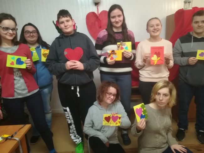 Spotkanie z okazji Walentynek odbyło się w grupach wychowawczych. Celem zajęć było rozwijanie u młodzieży takich wartości jak: miłość, przyjaźń, tolerancja, rodzina. Młodzież recytowała poezję o tematyce miłosnej. Wybrane wiersze dedykowali koleżankom i kolegom. Wykonywali również piękne kartki walentynkowe, które ofiarowali swojej Walentynce. Wychowankowie wzięli udział w konkursie piosenki – KARAOKE. Na zakończenie zajęć dla wszystkich uczestników zabawy był słodki poczęstunek.
