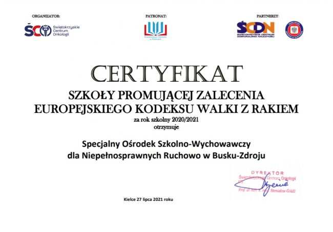 Nasza szkoła po raz kolejny wzięła udział w projekcie „Szkoła Promująca Zalecenia Europejskiego kodeksu walki z rakiem” który ukierunkowany jest na promocję zdrowego stylu życia poprzez edukację dzieci i młodzieży w zakresie prewencji pierwotnej nowotworów. Jest odpowiedzią na wyzwanie, jakim jest wysoka liczba zachorowań na raka. W ciągu całego roku szkolnego było podejmowanych wiele działań, które przyczyniły się do otrzymania kolejnego Certyfikatu Szkoły Promującej Zalecenia Europejskiego…