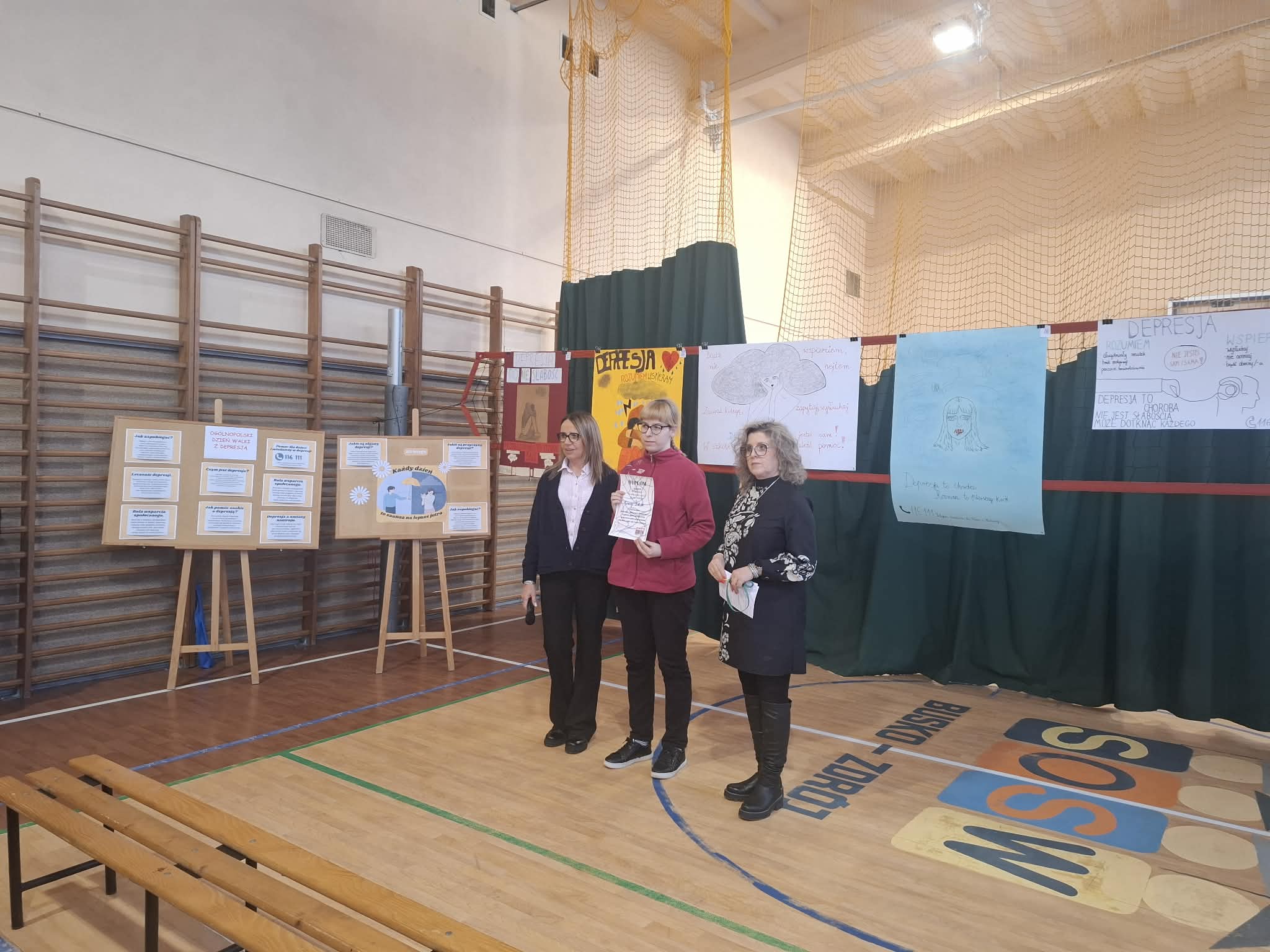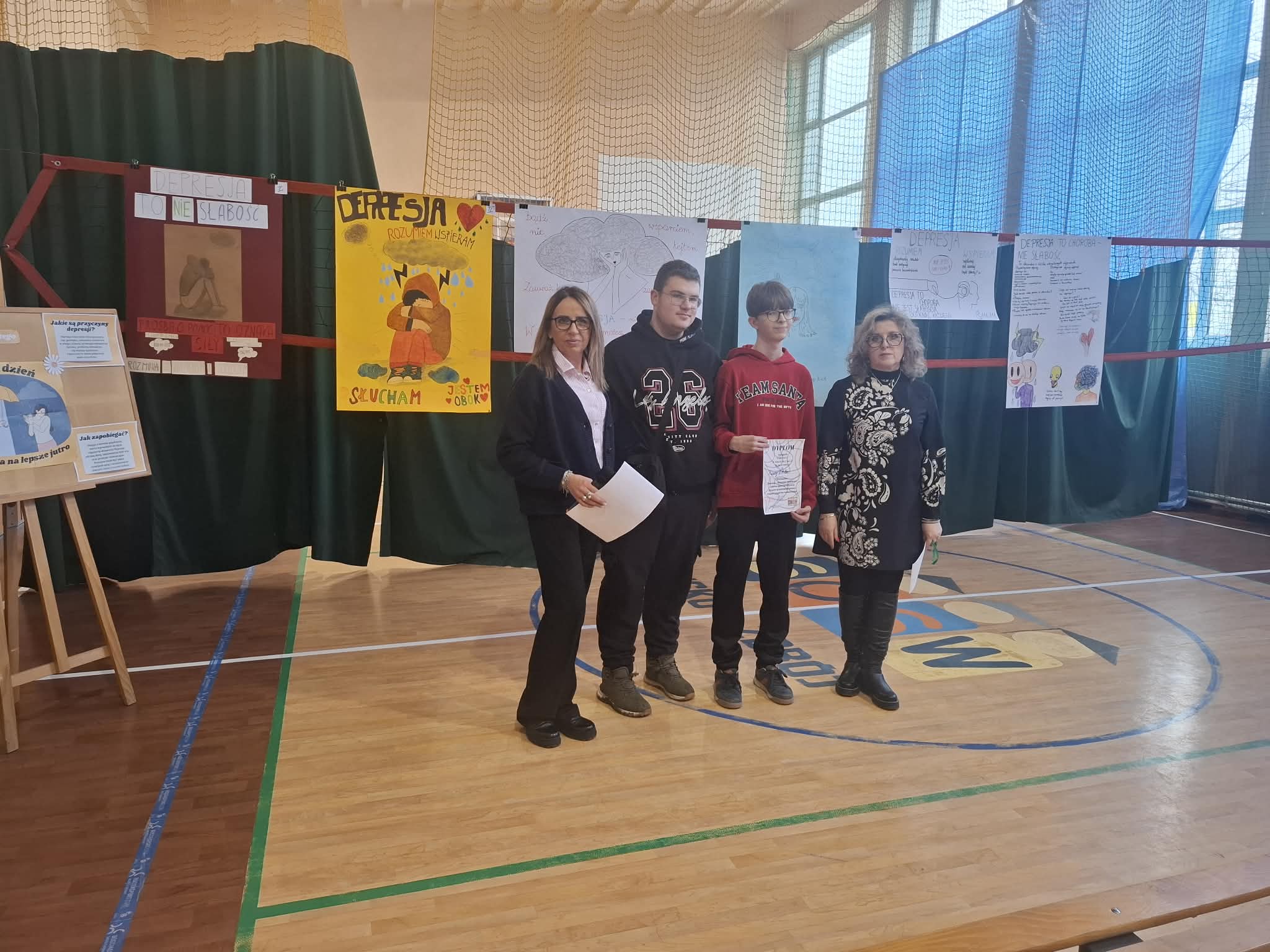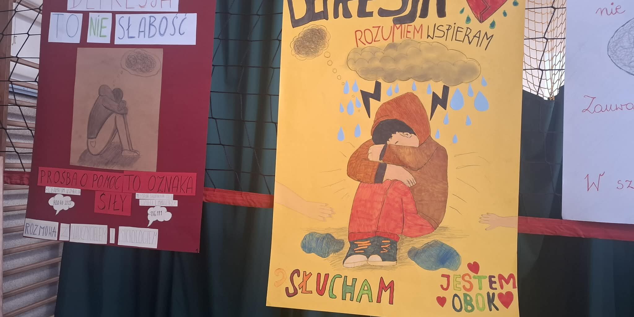 W naszej szkole uroczyście obchodzono Światowy Dzień Depresji, którego celem było zwiększenie świadomości na temat zdrowia psychicznego oraz podkreślenie znaczenia wczesnego reagowania na sygnały świadczące o kryzysie emocjonalnym. W ramach wydarzenia w zespołach klasowych przeprowadzono zajęcia poświęcone tematyce depresji, obejmujące jej objawy, możliwości udzielania wsparcia oraz dostępne formy pomocy. Warsztaty zostały zrealizowane pod opieką pedagoga Marzeny Jasiukowicz oraz psycholożek Magdy Błażejowskiej i Agnieszki Omasty, które zapewniły merytoryczne przygotowanie i profesjonalne wsparcie uczestnikom. Integralną częścią obchodów był konkurs pod hasłem „DEPRESJA – WIEM – ROZUMIEM”, w którym młodzież wykazała się dużą wrażliwością, dojrzałością i zaangażowaniem. Uczniowie przygotowali plakaty niosące ważny przekaz — zachęcający do reagowania, okazywania troski oraz korzystania z pomocy w sytuacjach trudnych emocjonalnie.