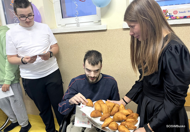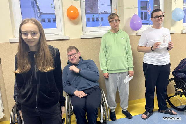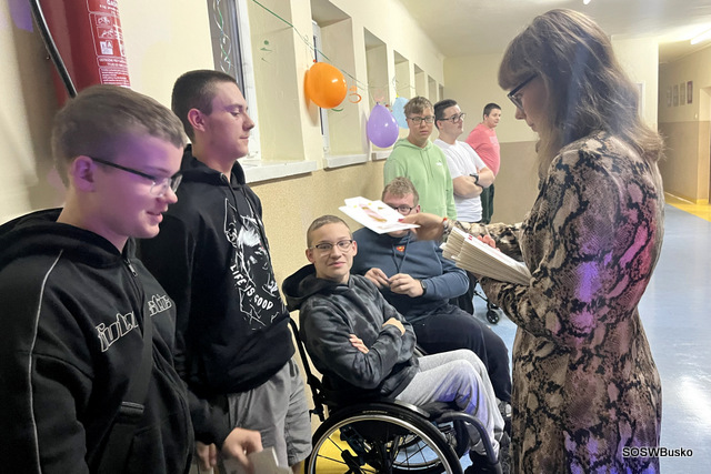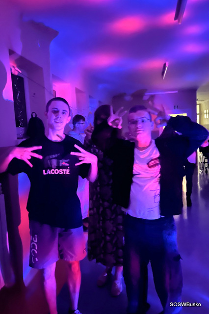 W dniu 30.09.2025r. Samorząd SOSW zorganizował dyskotekę integracyjną z okazji Dnia Chłopaka. W organizację imprezy zaangażowała się sekcja kulinarna, która pod opieką pani Marzeny Podkowy przygotowała smaczne pierogi z nadzieniem o smaku gyrosa oraz sekcja plastyczna, która wraz z panią Agnieszką Paterek zadbała o oryginalne kartki z życzeniami dla wszystkich chłopców. Dziewczęta samodzielnie wykonały papierowe ozdoby, którymi udekorowały korytarz w grupach wychowawczych. W tym dniu nie mogło zabraknąć szczerych życzeń oraz miłej atmosfery. Piękne życzenia sprawiły chłopcom ogromną radość, a piosenka w wykonaniu Izabeli z grupy I zrobiła na wszystkich ogromne wrażenie. Wychowankowie radośnie spędzili czas tańcząc na dyskotece, uczestnicząc w konkursach i słuchając skocznej muzyki. Chłopcy zostali również obdarowani słodkościami, które otrzymali od Dyrekcji naszego Ośrodka. Sprzęt nagłaśniający oraz kolorowe oświetlenie, o które zadbał pan Wojciech Jaworski, sprawiły że impreza była bardzo udana, zintegrowała wychowanków i sprawiła im dużo radości.