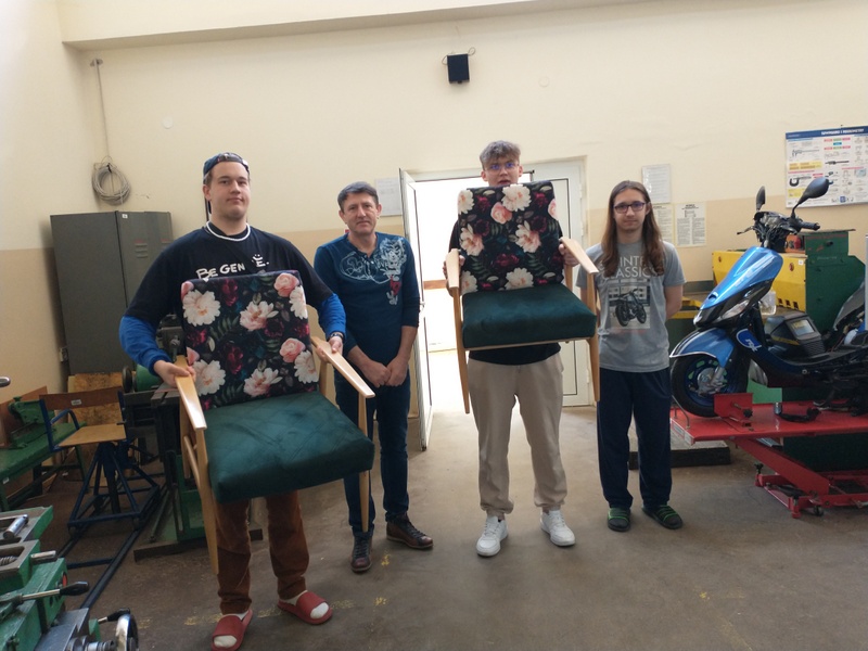Dziś dzięki pracy nauczycieli i uczniów w ramach projektu Klasyki dizajnu oddano do użytku odnowione pierwsze dwa fotele. Na przerwach uczniowie będą mogli odpoczywać w nowym, wygodniejszym otoczeniu.