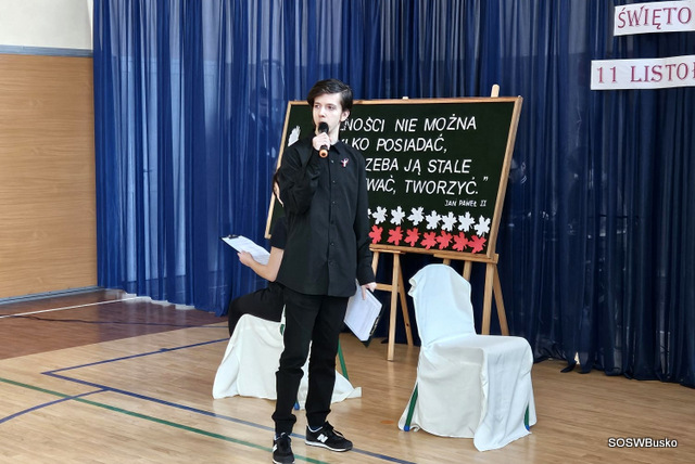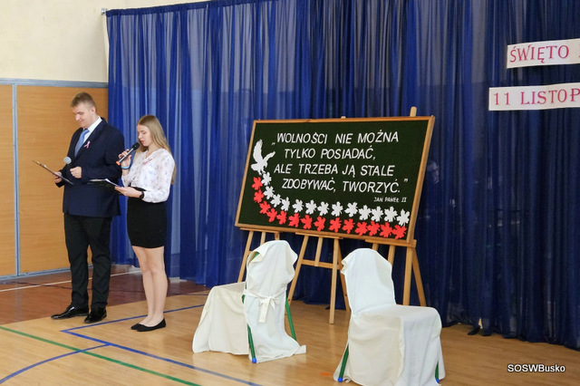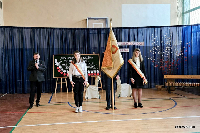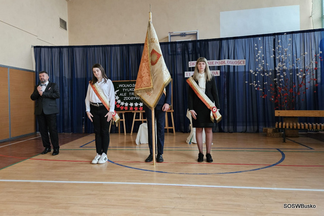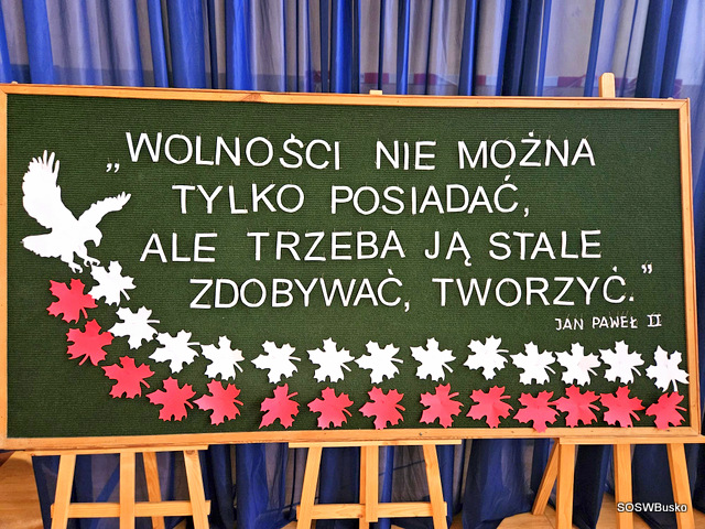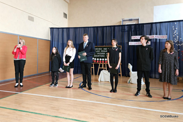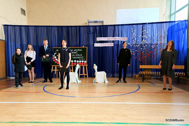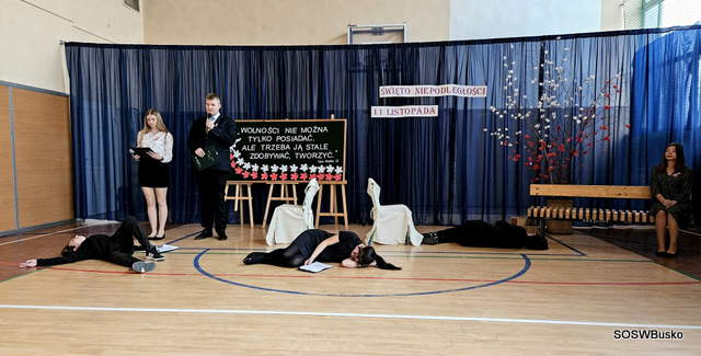 Po części oficjalnej, składającej się ze wspólnego odśpiewania hymnu i wysłuchania krótkiego wykładu historycznego, uczniowie zaprezentowali montaż słowno – muzyczny,