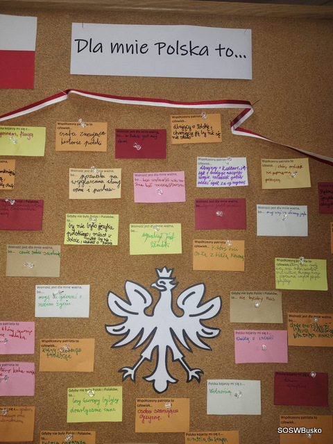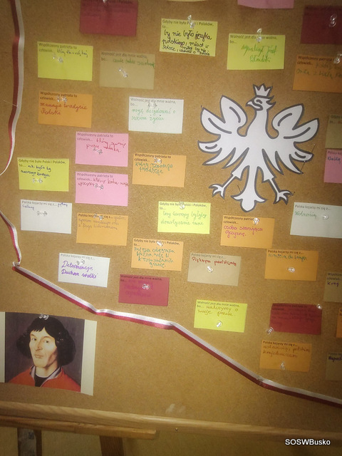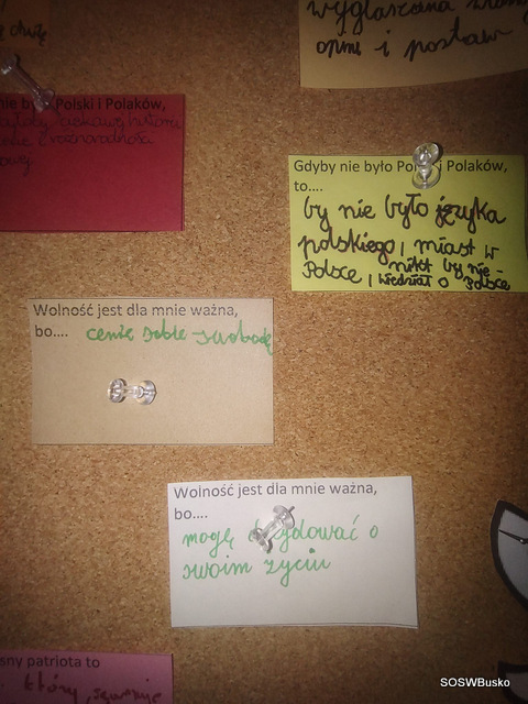 Zadaniem uczniów było dokończenie zdań: Polska kojarzy mi się z… ; Współczesny patriota to człowiek…; Wolność jest dla mnie ważna, bo…; Gdyby nie było Polski i Polaków, to… .