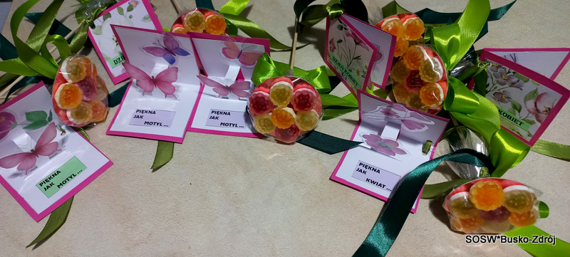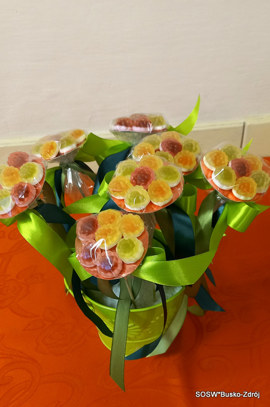 Z kolorowych, słodkich żelków powstały piękne, kreatywne kwiaty, które stały się nie tylko ozdobą, ale również pysznym poczęstunkiem. Chłopcy wykonali także mini laurki, w których znalazły się miłe słowa skierowane do każdej z dziewczynek.