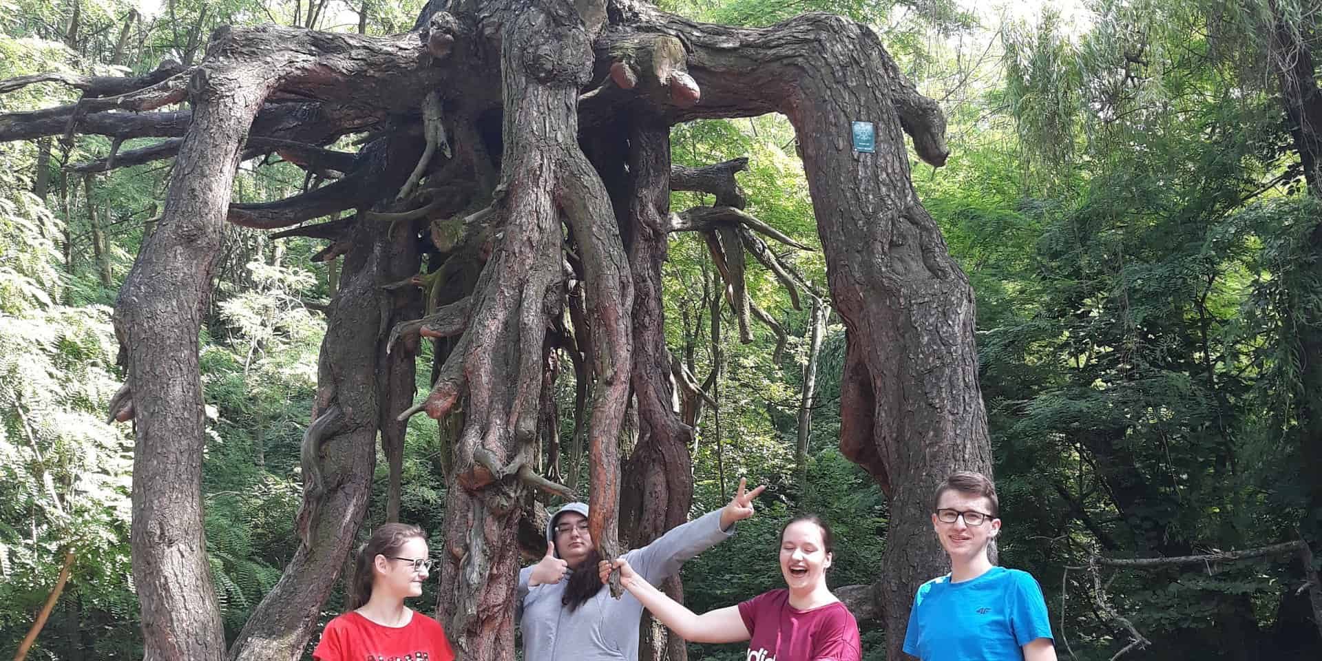 Następnym przystankiem był las sosnowy, który jest świetny na wycieczkę rowerową. Przystanęliśmy na chwilę aby pójść na krótki spacer po lesie i zobaczyć dość nietypowe drzewo, które miało korzenie na zewnątrz i szczególnie zwróciło naszą uwagę. Zauważyliśmy, że świetnie nadawałoby się się na domek na drzewie aczkolwiek jest to niemożliwe, gdyż jest to pomnik przyrody. Oczywiście nie mogło zabraknąć sesji zdjęciowej!!