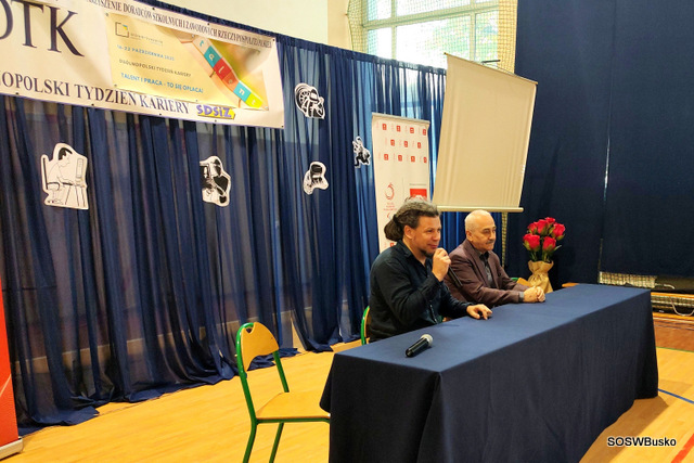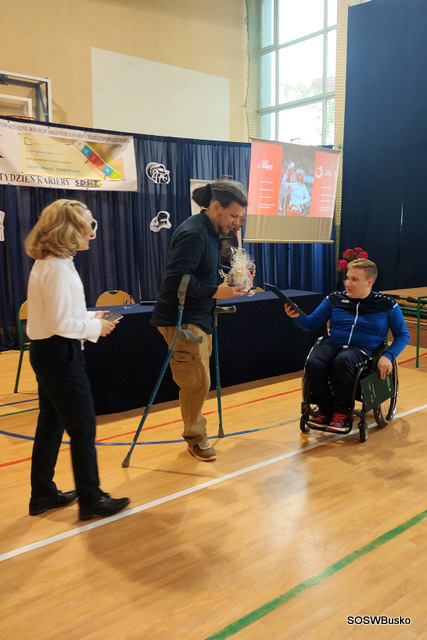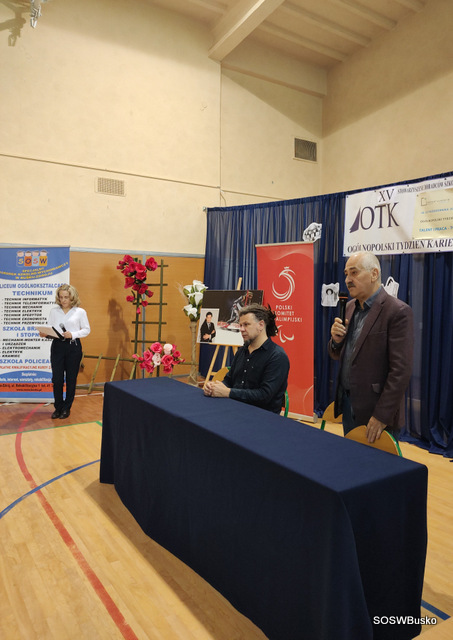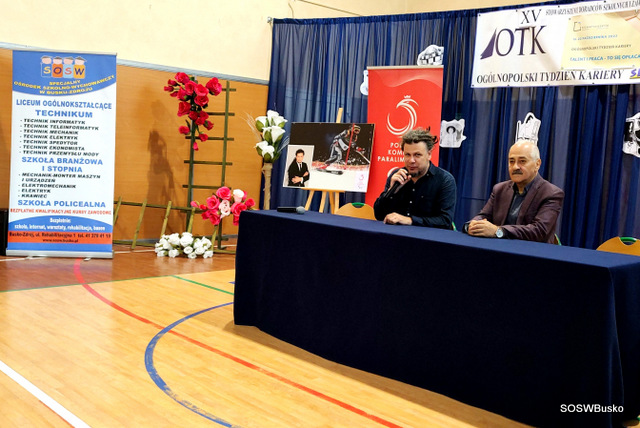 Jego wystąpienie miało charakter motywacyjny i wspierający. Następnie przedstawiciele uczniów Gabriel Kochman uczeń KL IV T i Karolina Gajos uczennica KL II SP TA wręczyli Panu Łukaszowi Szelidze podziękowanie, w imieniu Dyrekcji i młodzieży, za wspólnie spędzony czas, podzielenie się swoim doświadczeniem i sukcesami, które będą ich inspirować i motywować do pokonywania trudności w codzienności jak i dążeniu do wytyczonych celów.