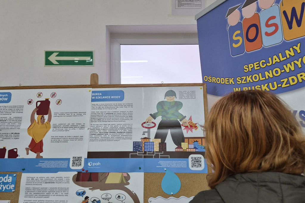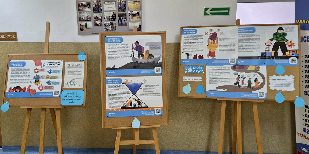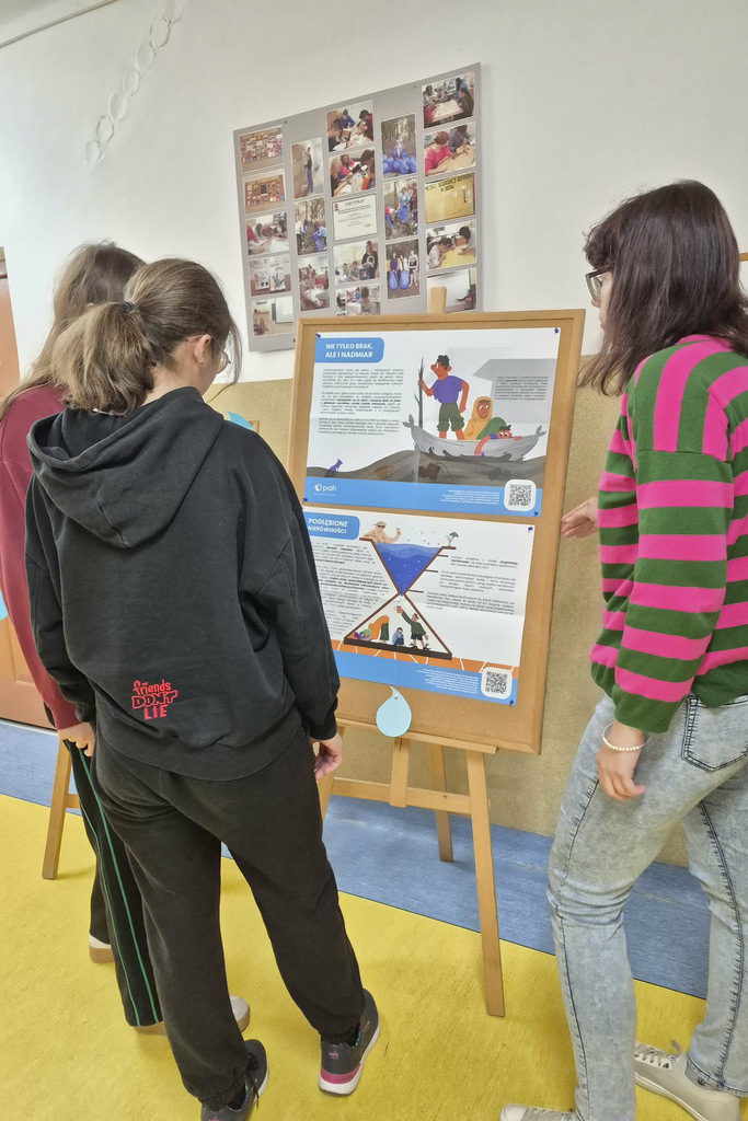 Dodatkowo w przestrzeni szkolnej została przygotowana wystawa plakatowa „Nie tylko suche fakty”, zachęcająca do refleksji nad problemem dostępu do wody na świecie, kryzysami wodnymi oraz znaczeniem pomocy wodno-sanitarnej. Wystawie towarzyszyły dyskusje oraz interaktywne quizy, które pozwoliły uczniom utrwalić i poszerzyć zdobytą wiedzę.