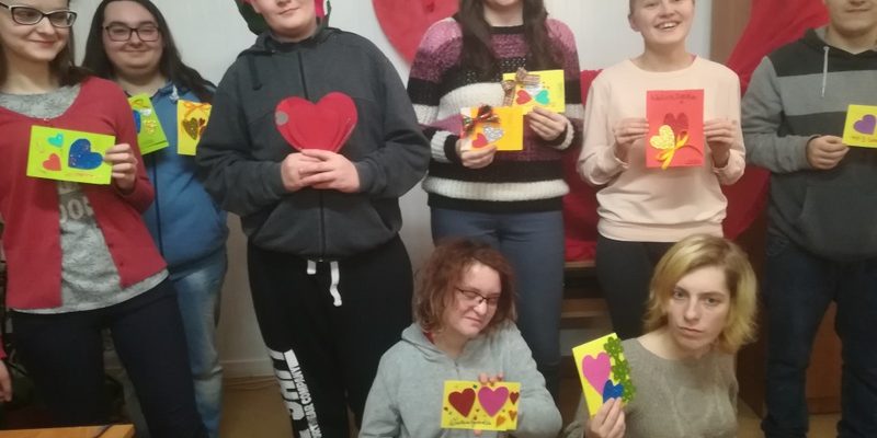 Spotkanie z okazji Walentynek odbyło się w grupach wychowawczych. Celem zajęć było rozwijanie u młodzieży takich wartości jak: miłość, przyjaźń, tolerancja, rodzina. Młodzież recytowała poezję o tematyce miłosnej. Wybrane wiersze dedykowali koleżankom i kolegom. Wykonywali również piękne kartki walentynkowe, które ofiarowali swojej Walentynce. Wychowankowie wzięli udział w konkursie piosenki – KARAOKE. Na zakończenie zajęć dla wszystkich uczestników zabawy był słodki poczęstunek.
