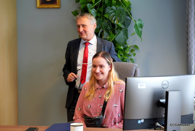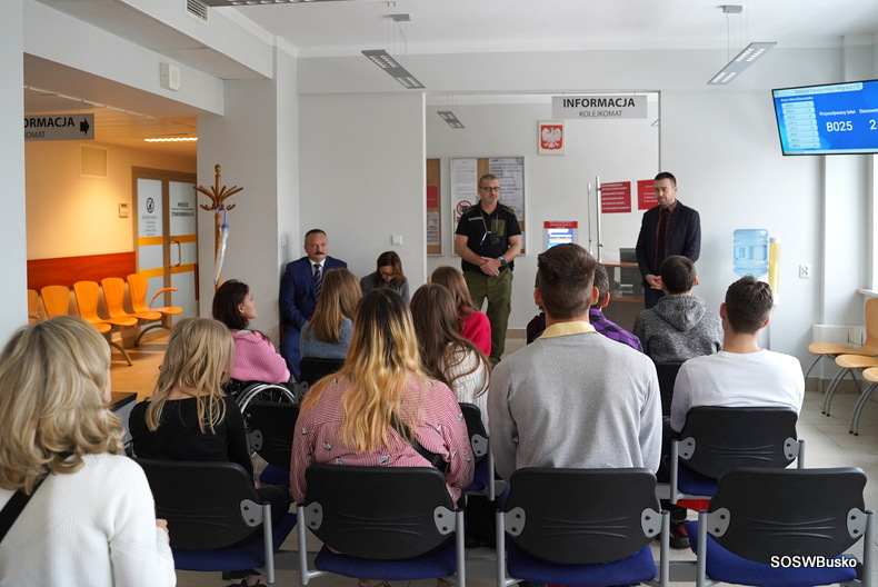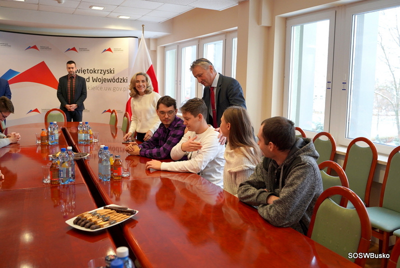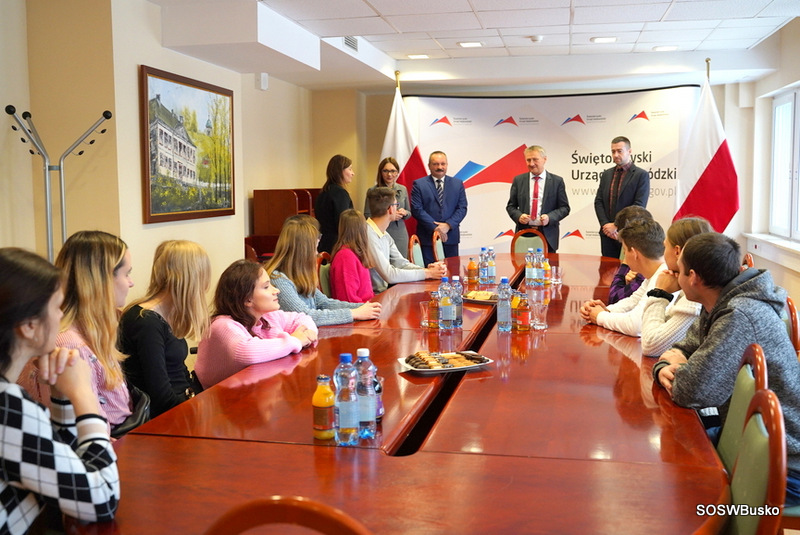 W sali konferencyjnej odbyło się spotkanie z Panem Zbigniewem Koniuszem Wojewodą Świętokrzyskim, który opowiedział o swoich obowiązkach. Następnie zaprosił wszystkich do gabinetu, w którym pracuje. Chętni mogli usiąść w fotelu i zrobić pamiątkowe zdjęcia. Pani Ewa Nowak opowiedziała jakie obowiązki spoczywają na Dyrektorze Biura Wojewody i pokazała odnowioną salę konferencyjną, w której odbywają się m. in. konferencje prasowe oraz inne ważne uroczystości. W Centrum Powiadamiania Ratunkowego uczestnicy wycieczki zobaczyli, jak na co dzień wygląda praca operatorów numeru 112, usłyszeli, jak przyjmowane są zgłoszenia. W sali szkoleniowej uczniowie obejrzeli film edukacyjny dotyczący rodzajów zgłoszeń oraz zapoznali się z instrukcją, jak prawidłowo wykonać zgłoszenie. Dowiedzieli się, że pracuje 46 operatorów, szkolenie na to stanowisko trwa dwa tygodnie, kończy się egzaminem, konieczna jest znajomość języka obcego. Po zdaniu egzaminu ostatecznym potwierdzeniem umiejętności jest zgłoszenie testowe, o którym operator nie wie. W wydziale paszportowym uczniowie dowiedzieli się jak wygląda procedura otrzymania paszportu oraz kiedy wydaje się ich najwięcej. Sprawdzali jak pobierane są odciski palca.