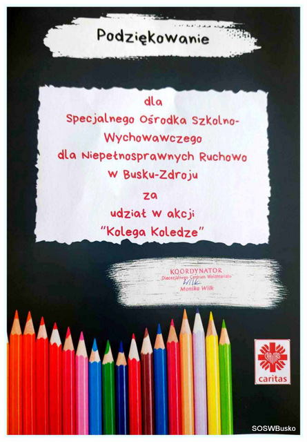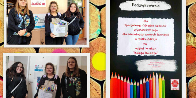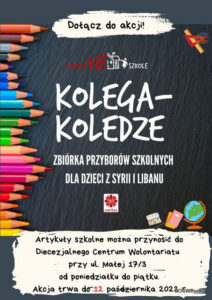 Pod koniec września dołączyliśmy w naszym Ośrodku do akcji „Kolega-Koledze”, której organizatorem są Caritas oraz Diecezjalne Centrum Wolontariatu w Kielcach. Akcja miała na celu pomoc dzieciom z Syrii i Libanu. Uczniowie działający w Szkolnym Kole Wolontariatu promowali akcję na terenie Ośrodka, informując koleżanki i kolegów o możliwości przyniesienia przyborów szkolnych, które zostaną później przekazane Caritas Polska i trafią do dzieci potrzebujących wsparcia. Zachęcali do włączenia się w zbiórkę i przekazania przyborów do opiekunów Szkolnego Koła Wolontariatu. Udało się zebrać zeszyty, bloki, długopisy, ołówki, kredki, farby, kleje, gumki do ścierania i inne przydatne w szkole artykuły.
