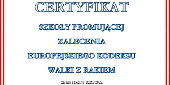 Po raz kolejny nasza szkoła otrzymała Certyfikat Szkoły Promującej Zalecenia Europejskiego Kodeksu Walki z Rakiem za rok szkolny 2021/2022 przyznanego przez Dyrektora Świętokrzyskiego Centrum Onkologii prof. dr hab. n. med. Stanisława Góździa.